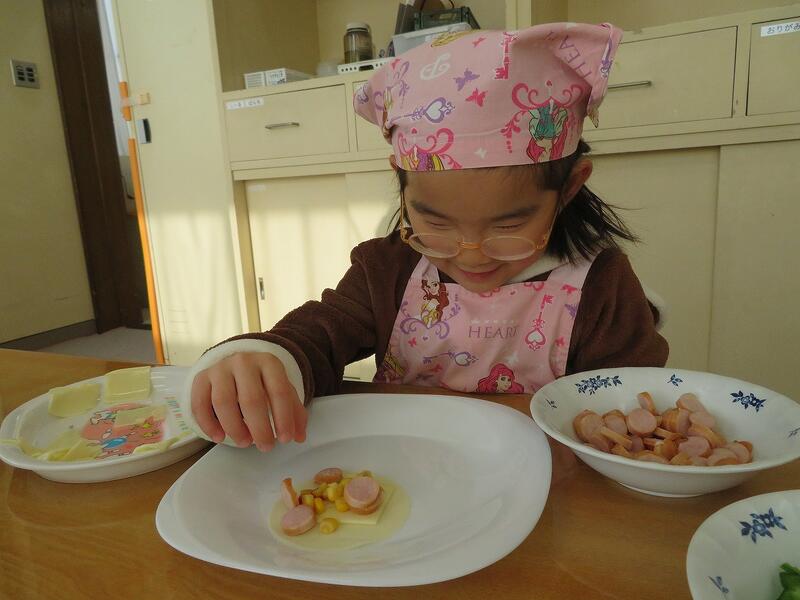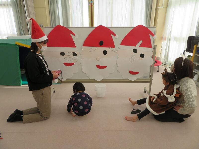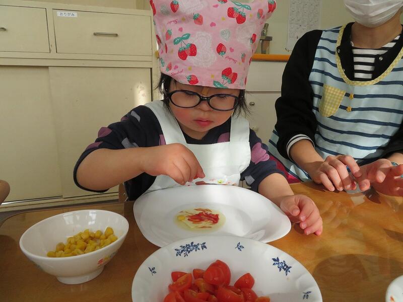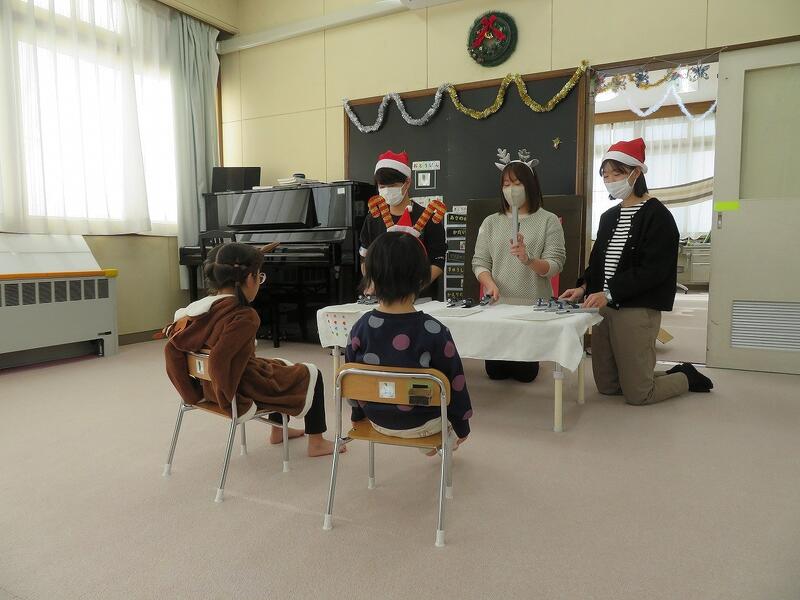 12月22日(月)に幼稚部でクリスマス会を実施しました。「サンタが街にやってくる」を歌った後、教職員によるトーンチャイムの演奏を聴きました。サンタクロースの福笑いで楽しんだ後、餃子の皮ピザ作りをしました。コーンやソーセージなど、好きな食材を置いて、オリジナルピザができました。完成したピザはみんなで食べました。
