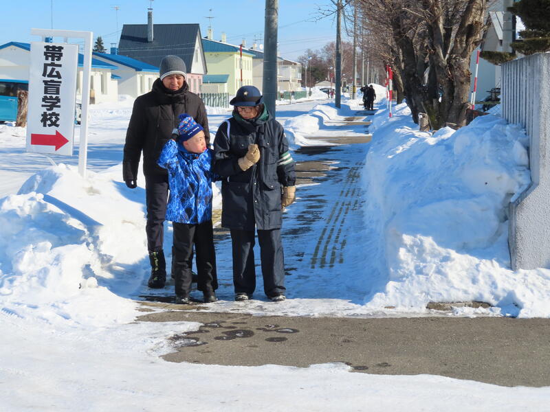 1月23日(金)に交通安全教室を実施しました。小学部2名、中学部2名全員が参加し、冬の道路の安全な歩き方を交通安全指導員の4名の方々に教えていただきました。当日は快晴、積雪量は30㎝ほど。所々で路面が凍結していたり、雪山ができ見通しが悪かったりという環境の中、指導員の方々のアドバイスを受けながら、安全に歩くことができました。歩道の付近を車が通る場面がありましたが、車音を聞いて止まり、目視で確認しながら歩くことができていた生徒もいました。今後も外出の際には、今回学んだことを生かし安全に歩きましょう。